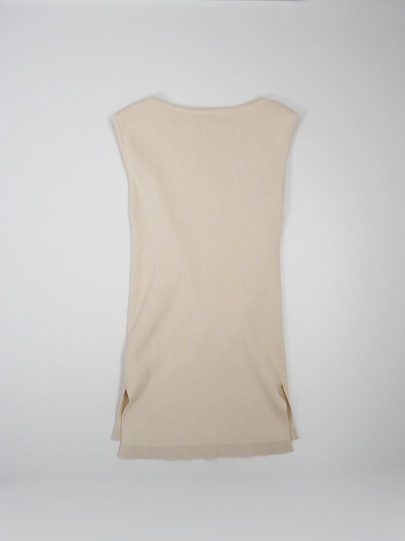 しなやかな風合いがあり光沢のあるとろみ感が特徴のボートネックノースリーブです。